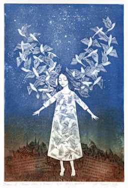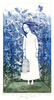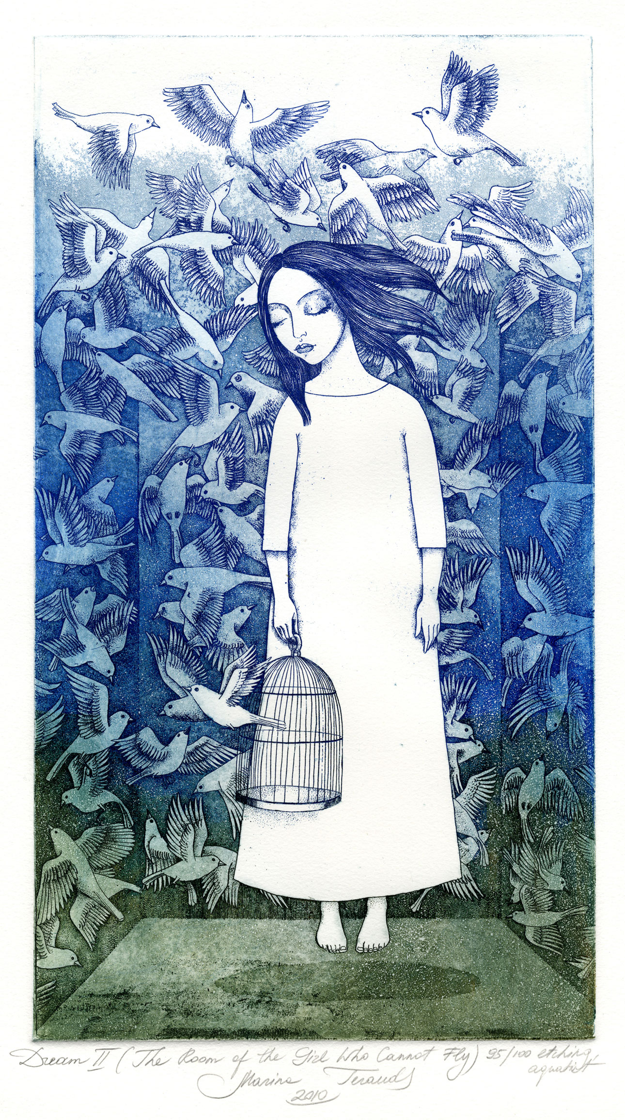 Dream II "There is a girl in my imagination that wishes that she could fly. But reality intervenes and she remains bound to the earth. In my dream series her wishes are materialized through the powers of her dreams. Dreams are progressive. My first inspiration was DREAM I (formerly simply called DREAM). In this subsequent work, DREAM II, my imaginary girl has opened her captive cage and is letting her imagination fly. The wallpaper takes on a form of life and my imaginary girl escapes the shackles of gravity." --Marina Terauds |