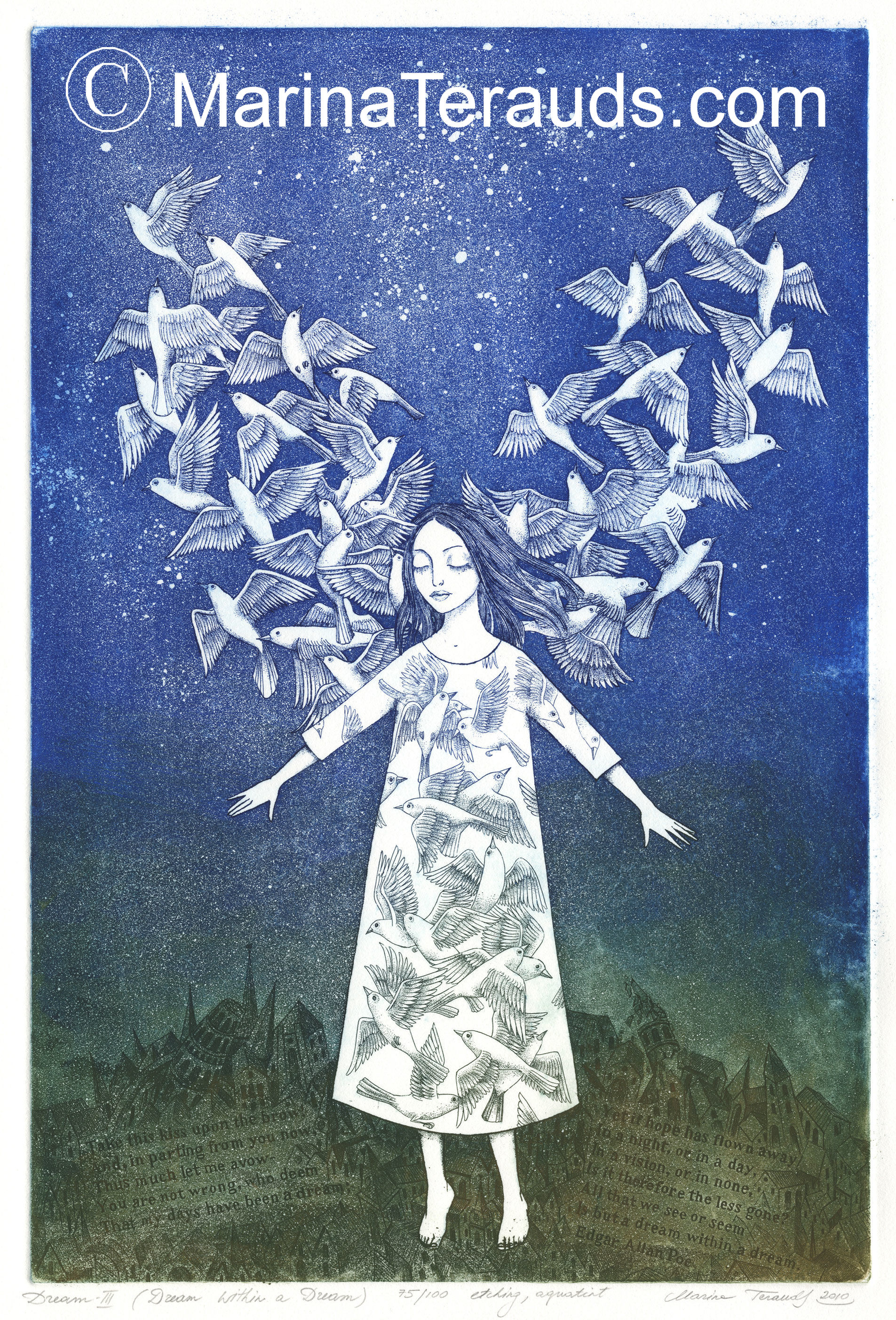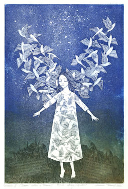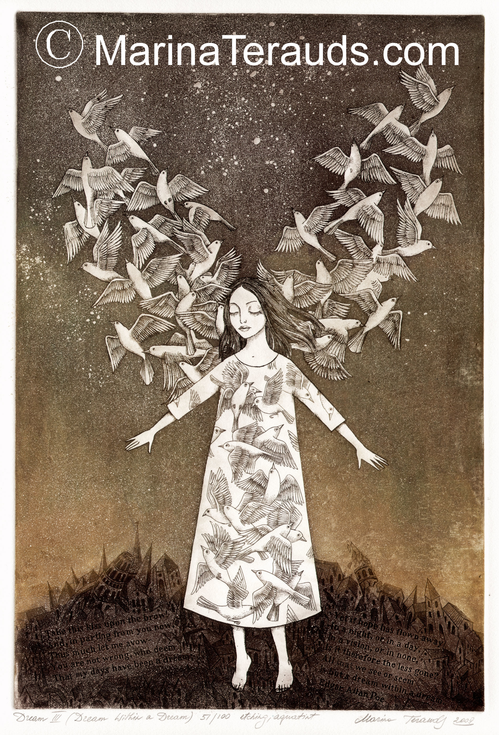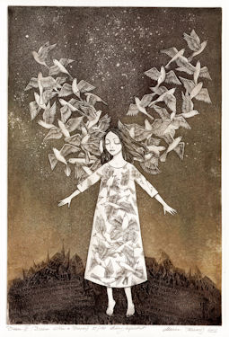 This is my third expansion on the Dream Series. The expressionless, and seemly, emotionless girl of my imagination has continually exhibited a state of stillness and disconnect from her surroundings. She is dreaming. . . and this detachment could be viewed as a stationary emotion, masking all growth. But over the scope of the series I have tried to evoke a progression whereby my imaginary girl was evolving and now finally has harnessed the full powers of her dreams. With the aid of her subconscious she has achieved the freedom she has dreamt about. Yet it remains, but a dream. And for me . . . a dream within a dream --Marina Terauds |