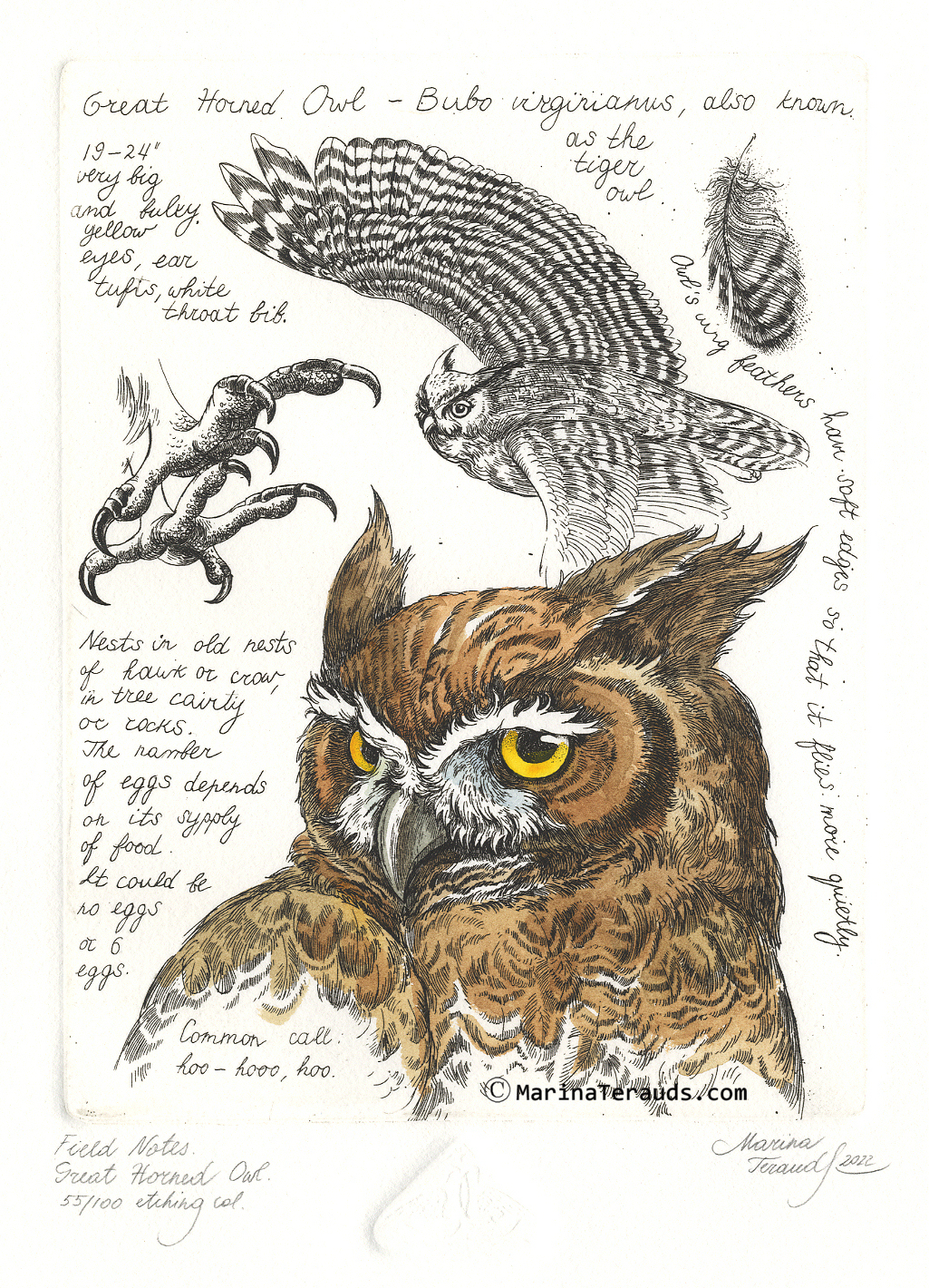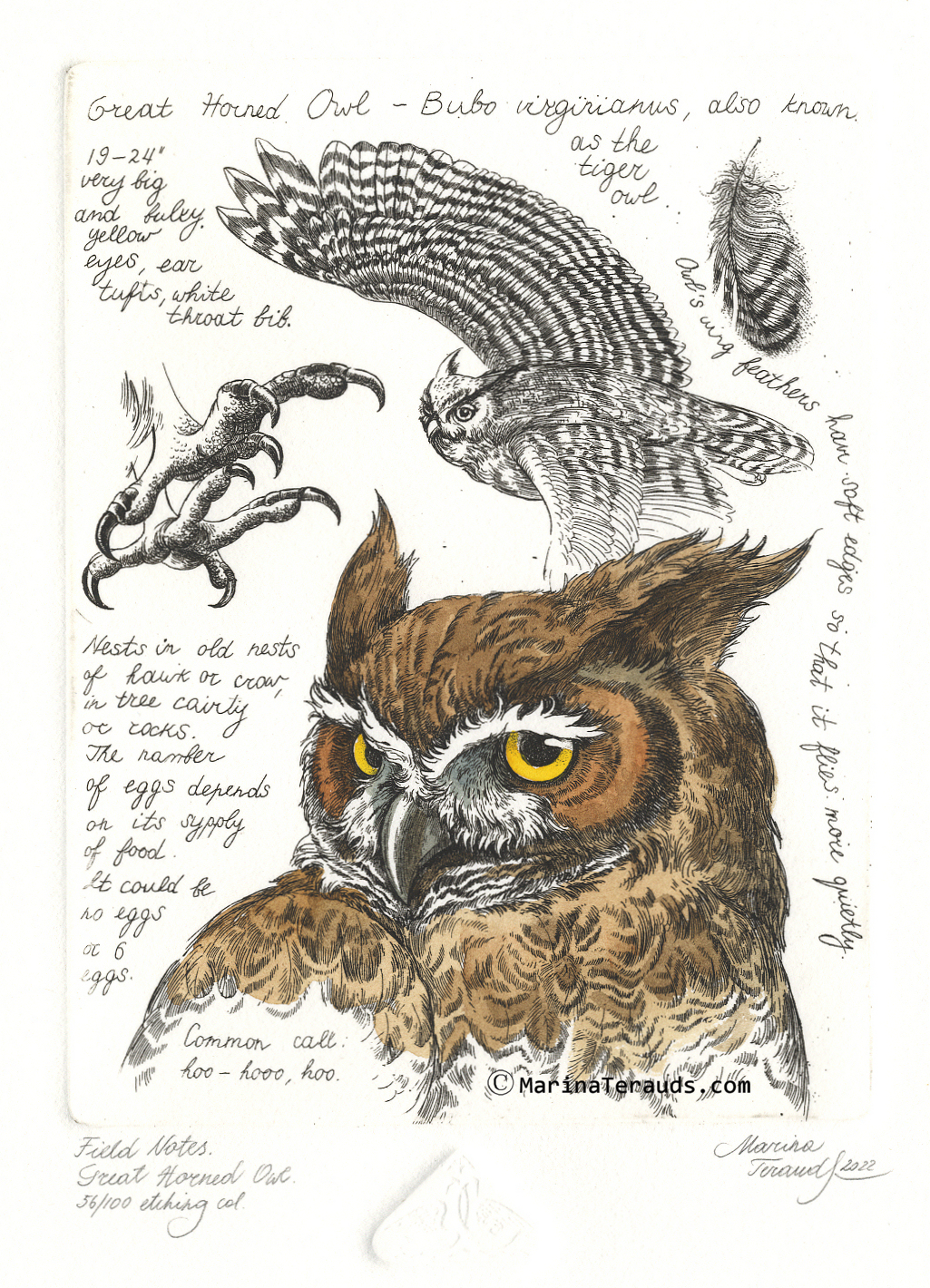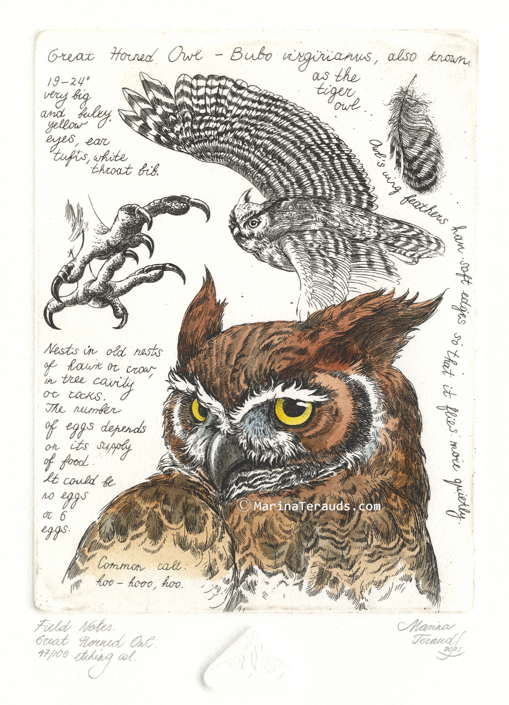 Field Notes, Great Horned Owl, original etchings |